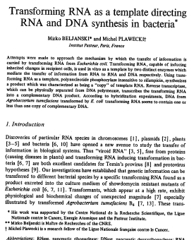 ABSTRACT: Attempts were made to approach the mechanism by which the transfer of information is carried by transforming RNA from Escherichia coli. Transforming RNA, capable of inducing inherited changes in recipient cells, is used in vitro as a template by two distinct enzymes which mediate the transfer of information from RNA to RNA and DNA respectively. Using transforming RNA as a template, polynucleotide phosphorylase insensitive to rifampicin, synthesizes a product which was characterized as being a “copy” of template RNA. Reverse transcriptase, which can be physically separated from DNA polylerase, transcribes the transforming RNA into a complementary DNA product. According to hybridization experiments, DNA from Agrobacterium tumefaciens transformed by E. coli transforming RNA seems to contain one or less than one copy of complementary DNA.Read the full publication